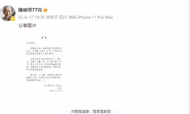 他的兒子用其視頻帳號分享了相關的噩耗,並公開訃告,訃告中顯示,陳彼得是在6月14日上午9時46分在成都安詳辭世的,終年82歲。