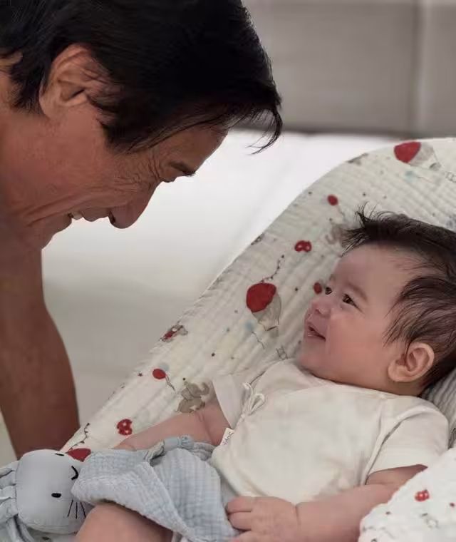照片中除了小傢伙之外,還有其外公梁家輝,他對著自己的外孫露出和藹可親的笑容,兩爺孫對視的畫面看起來十分有愛,難怪網民表示,隔著螢幕都能感受到梁家輝那要溢出來的笑容,相信梁家輝的女兒也是因為看到這一幕才忍不住拍了下來。