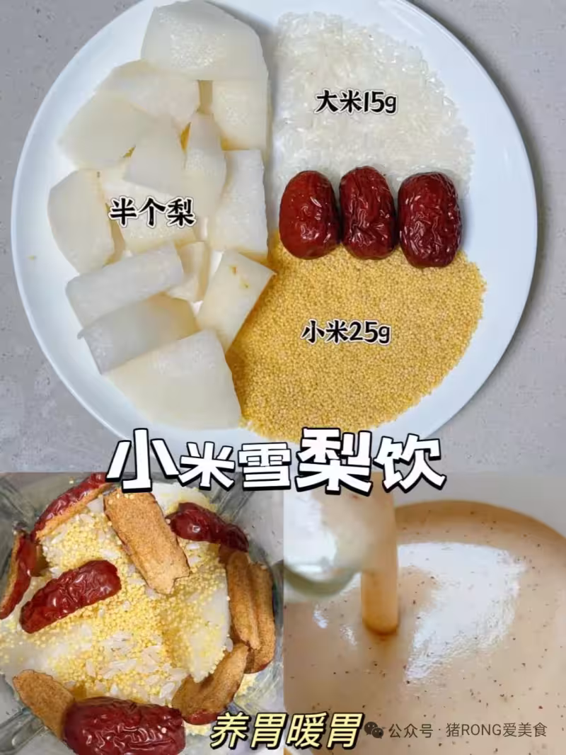 3️⃣小米雪梨飲:半個梨+大米15g+小米25g+紅棗3顆+加水 破壁機水位線600ml位置