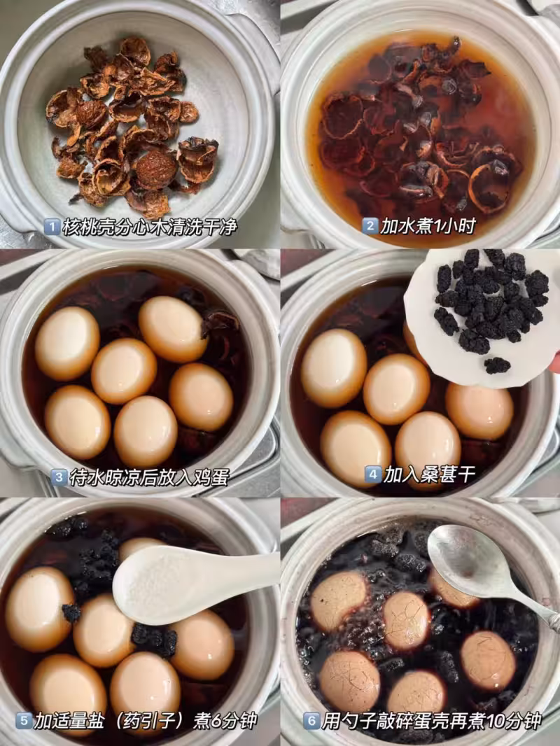 2. 等水晾涼,放入洗凈的雞蛋、桑葚乾和鹽,繼續煮6分鐘。