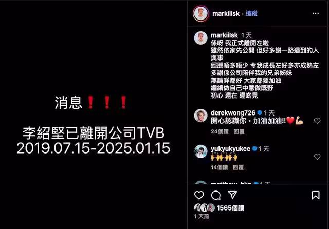 李紹堅就在社交平台表示,他其實一早於2025年1月已經離巢了,不過現在才正式宣布,也感謝一路上遇到的人和事,經歷不算大也不算小,但是自己成熟很多。