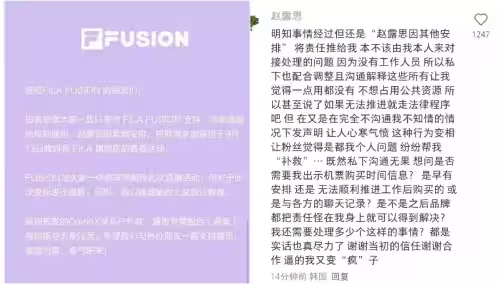 趙露思8月就陸續表示自己要跟經紀公司銀河酷娛解約,但對方不放人,趙露思就成立自己的公司接工作,怎料原訂昨日要參加的FILA FUSION直播又被取消。有粉絲推測是銀河酷娛以肖像權為由出手阻攔,故意擋趙露思財路,但FILA FUSION的聲明卻說是因為趙露思有其他安排才無法出席活動,這讓趙露思不滿,直接在FILA FUSION的公告下留言開罵。