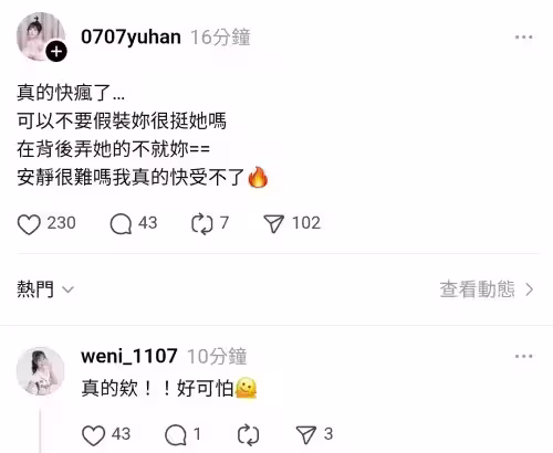 在禹菡的發文下,另一位同期入隊的溫妮罕見留言附和:「真的欸!!好可怕!」疑似暗示自己也察覺到內部有人在暗中操縱輿論,不僅如此樂天女孩小紫更進一步質疑:「為什麼那個人會知道升等後的位置叫啥名稱?還看得到嘎琳拿出信用卡?」直言細節泄漏過於精準,令人毛骨悚然,這些回應讓「內鬼」疑雲更加濃厚,粉絲之間的猜測也持續延燒。