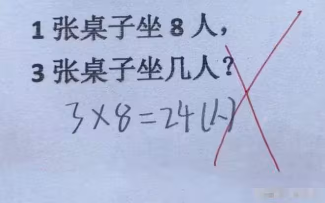比如這個二年級的數學題:1張桌子坐8人,3張桌子坐幾人?