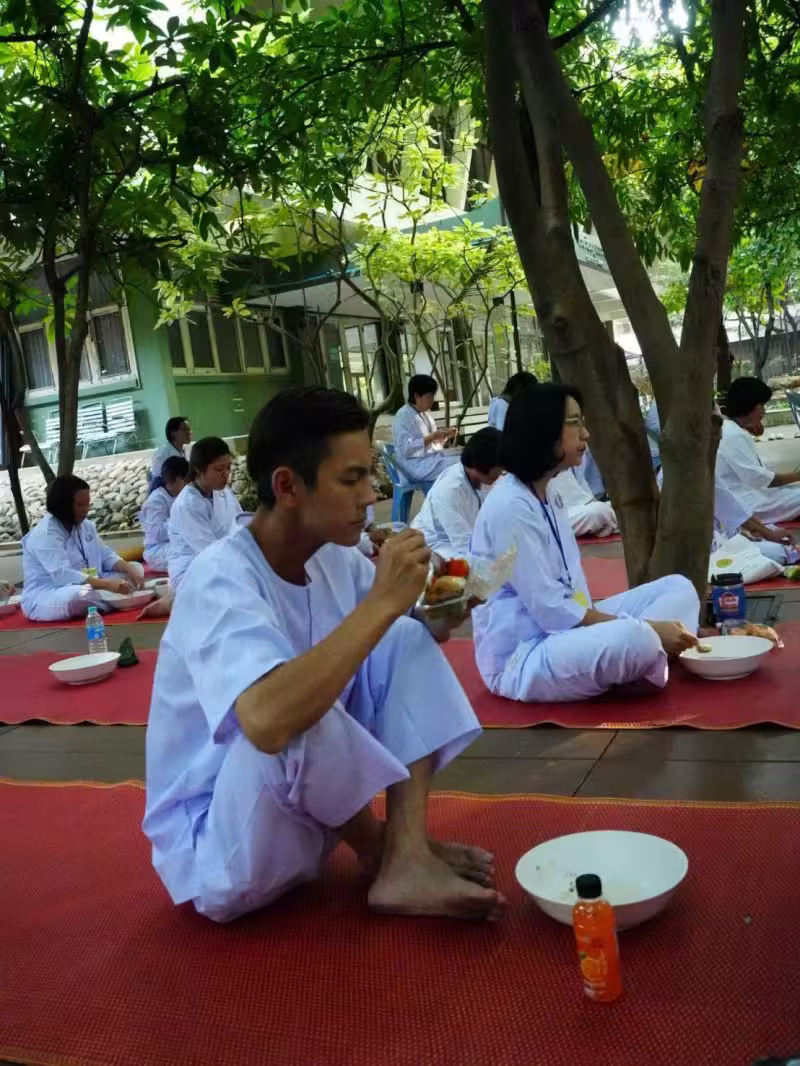 然而無法如阿翔所願,念經後修行體驗並未就此結束,早上六點他必須跟隨寺廟師父一同赤腳外出化緣,讓他震驚的是,當地居民都會提前準備化緣的食物,包括粿條、餅乾、飲料、水果等,化緣得到的食物師父們會在當天中午食用,雖然修行者無法食用化緣所得,但寺廟會另外準備餐點給他們吃。