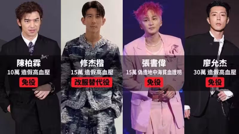 檢方今(21日)再展開第三波搜索行動,陸續帶回陳柏霖、修杰楷、「Energy」張書偉等人。據了解,修杰楷認服替代役前先花15萬元以高血壓方式意圖免役,但因不夠嚴重得服替代役;陳柏霖稍早也坦承,花10萬偽造高血壓成功「閃兵」;Energy書偉、棒棒堂小傑,則分別坦承花15萬、30萬元找閃兵集團偽造地中海貧血、家族遺傳病免服兵役。