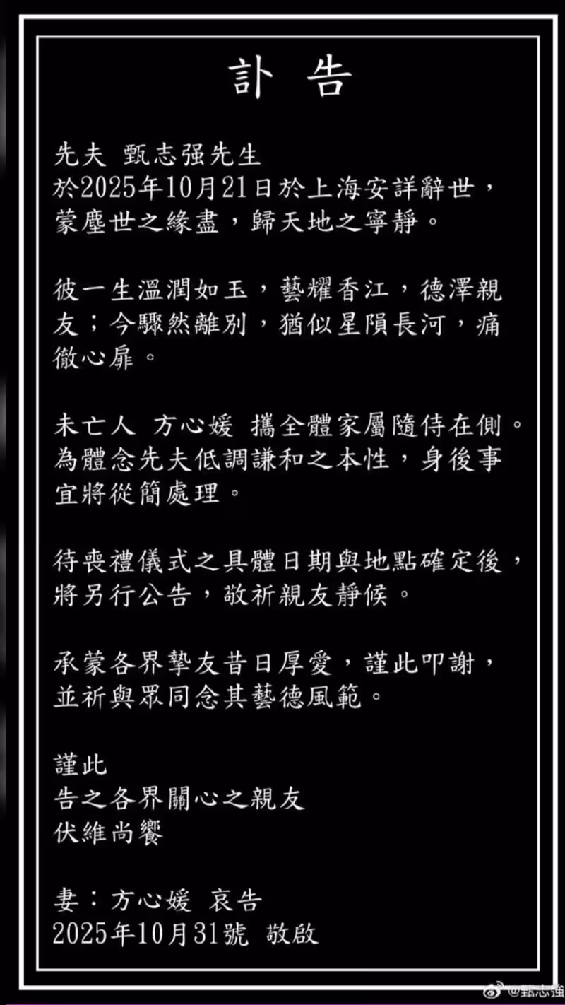 不過甄志強鮮少提及婚姻生活,兩人對婚姻生活相當低調,未料這次方心媛發聲竟是因為丈夫的死訊。
