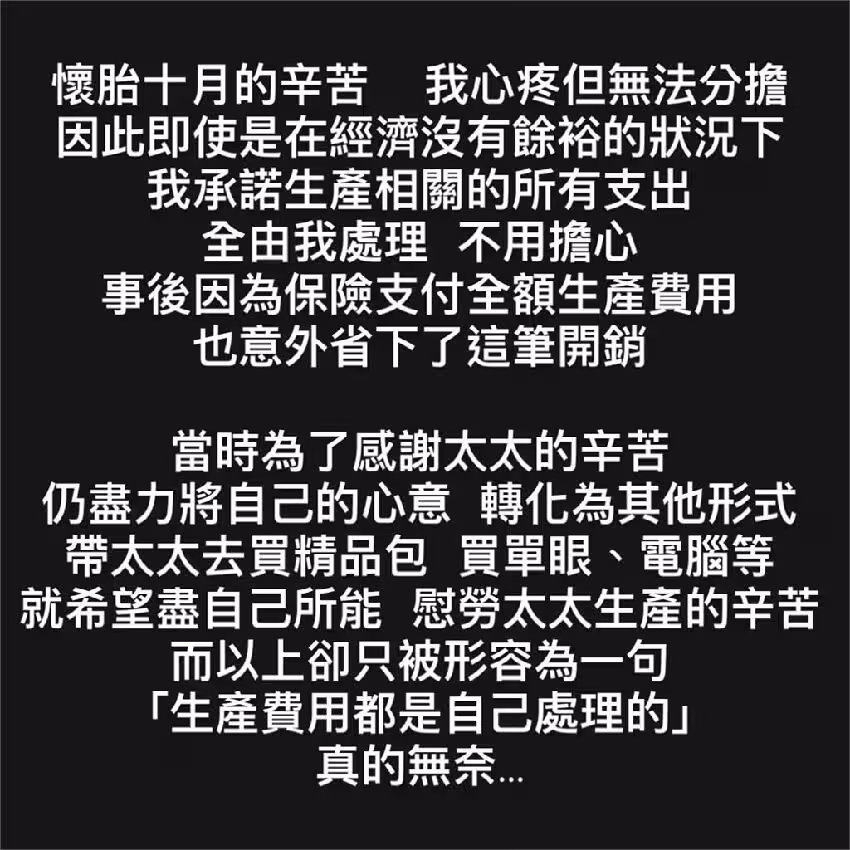 他指出,上述費用卻被女方形容成「生產費用都是自己處理的」,令他無奈。