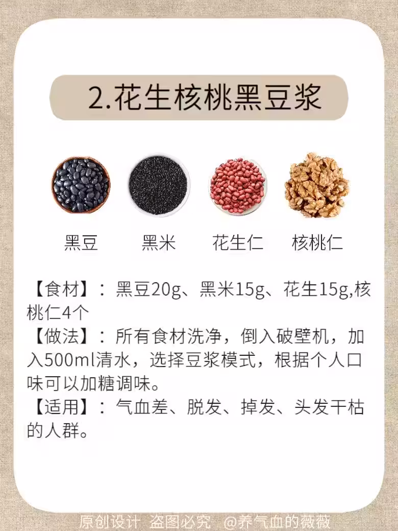 補腎烏髮:黑豆、黑米和黑芝麻皆為中醫推崇的補腎烏髮食材。經常飲用有助於滋養腎臟,改善因腎虛引起的脫髮、頭髮乾枯、腰膝酸軟等問題。