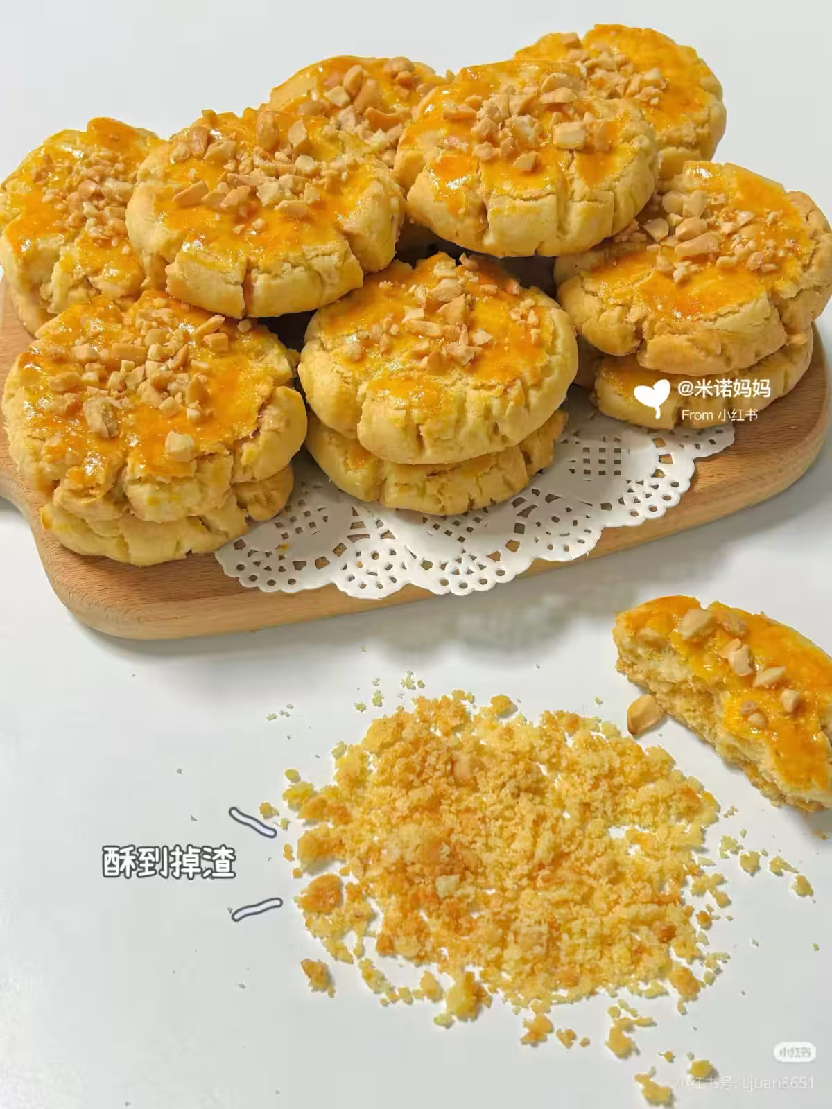 🌈準備食材 低筋麵粉250g | 花生碎50g | 玉米油120g | 糖30g | 泡打粉4g | 🥚蛋1個 | 蛋黃液1個(刷表面)