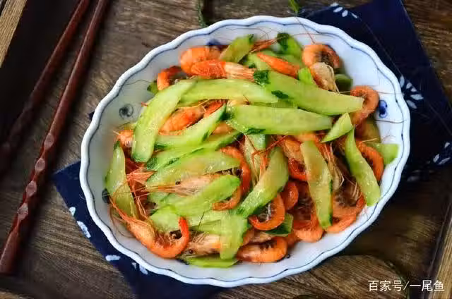 材料:河蝦150克、黃瓜1根、黃酒1湯匙、蒜頭2瓣、鹽3克