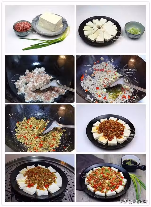 第六步:將炒好的肉末放在豆腐上,如圖。