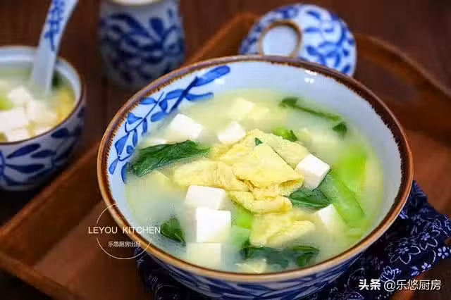 第一步:準備食材。雞蛋3個、嫩豆腐1塊、油菜3棵、大蔥1段。
