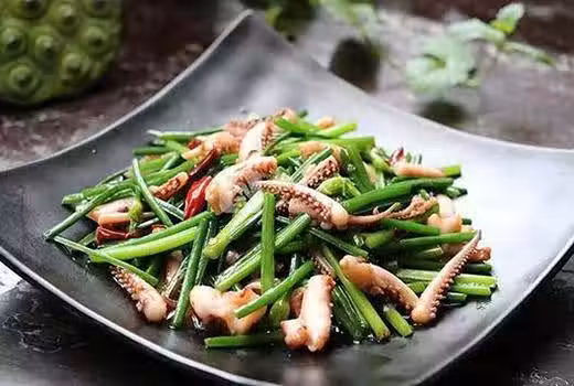 300g韭菜、300g魷魚、1段大蔥、2片姜、2瓣大蒜、適量食用油、適量醬油、適量精鹽、適量甜麵醬。