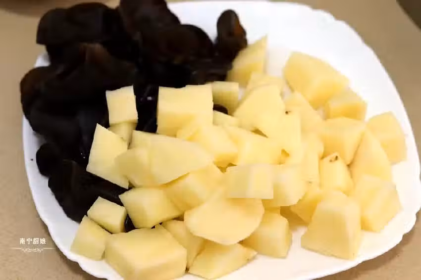 2、把土豆去皮後切塊、木耳洗凈備用。