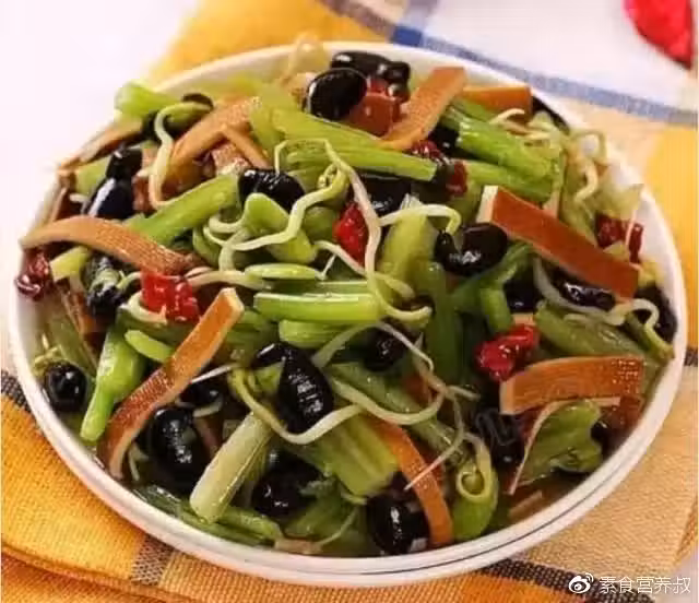 食材:250克芹菜,100克黑豆芽,130克鹵豆皮,1個干辣椒,5克姜,3/4茶匙鹽,1/4茶匙味精,適量水澱粉,熟植物油