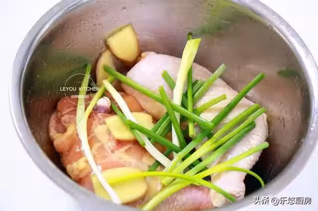 第六步:腌制結束後,從冰箱中取出。找一個大盤子,先在盤底鋪一些薑片和香蔥段,然後放上雞腿,在雞腿表面再放一些香蔥段和薑片,如圖。