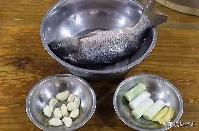 蔥段、薑片、大蒜子、鯉魚(鯉魚是提前宰殺好的)