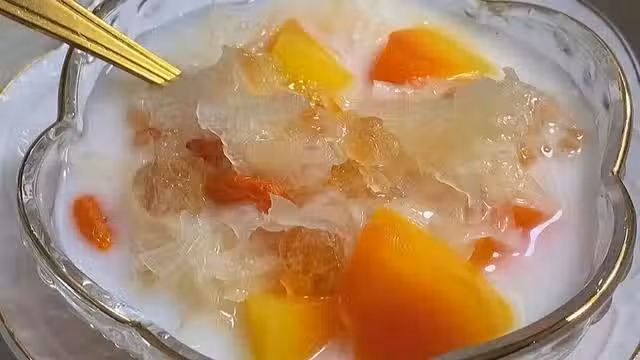 把銀耳撕碎,桃膠沖洗乾淨,適量的蓮子,一罐椰奶倒入鍋中,適量的清水,大火煮開煲了30分鐘,再把木瓜倒進鍋中,再加冰糖,繼續煮十分鐘後,再下入枸杞。木瓜桃膠甜湯就做好了。