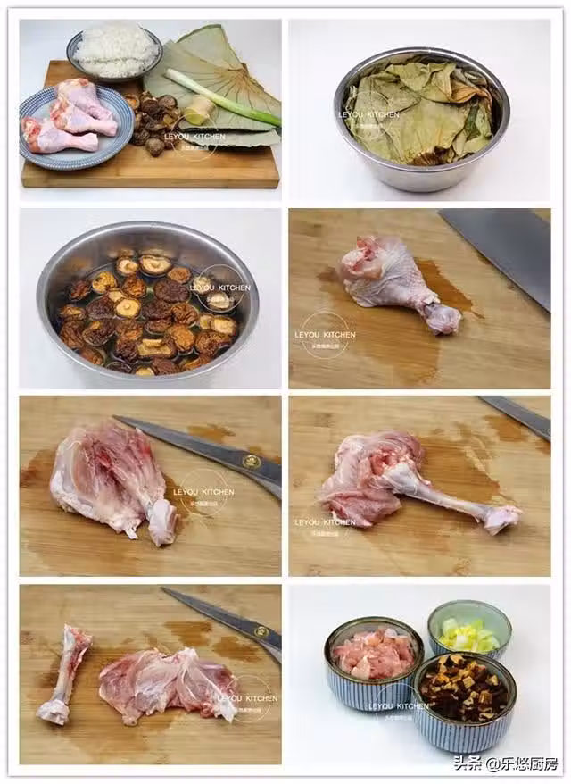 第八步:把雞腿肉切成丁、香菇切丁、蔥姜切末備用。