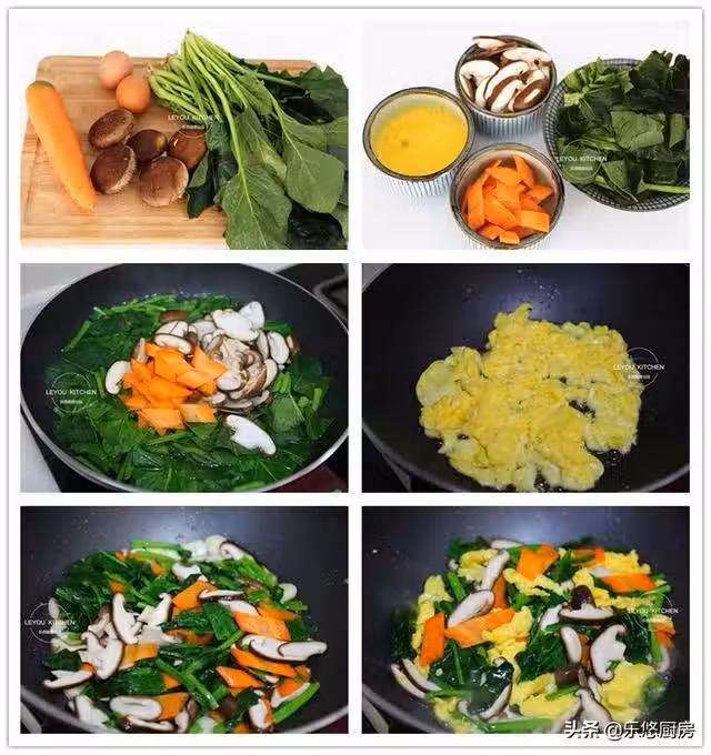 菠菜、胡蘿蔔、香菇焯水後,下鍋炒時,不用炒太長的時間,放入調味料快速翻炒均勻就可以出鍋了。