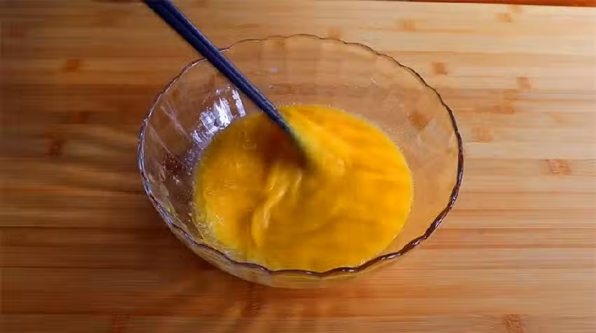 2.大碗里嗑入4個雞蛋打散,放100克白砂糖,倒入80毫升純牛奶,攪拌至白糖融化後,倒入100克普通麵粉繼續攪拌,攪成無顆粒狀,倒入平底鍋里用小火使用鏟子不斷的翻拌,拌成大朵的面塊,關火,放涼備用。這個就是奶黃餡。