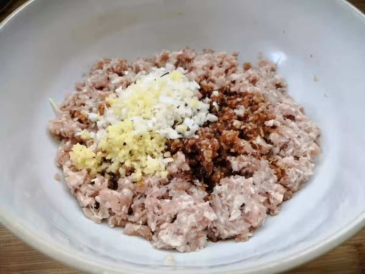6、分三次加入適量水,順一個方向攪勻,直到全部吸收乾淨,把肉餡攪上勁,最後加入炸好的料油,攪拌均勻腌制一會。