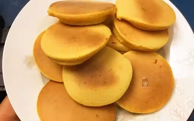 6、把麵糊用裱花袋擠入電餅鐺,擠一個小圓形餅,喜歡吃厚的可以多擠點麵糊,喜歡吃薄一點的就少擠點麵糊。烙至微黃再翻一次面,我今天烙的小餅不厚,翻三到四面就可以。大約烙三分鐘左右,看小餅都鼓起來,就說明已經熟透可以裝盤出鍋了。