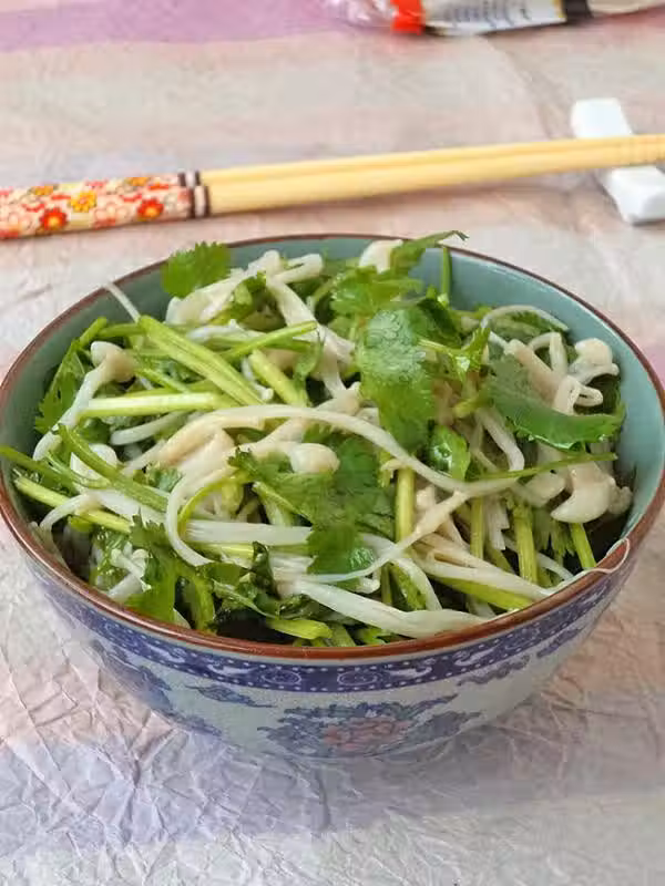 5. 香菜、金針菇放在同一容器中,加鹽,鮮蔬粉、芝麻油攪拌勻即可
