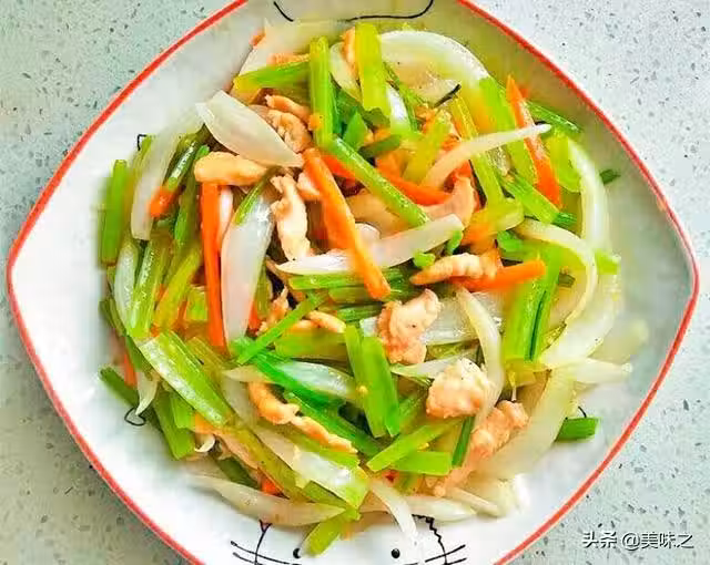 2、控乾的香芹切段,胡蘿蔔去皮洗凈切絲,洋蔥也切絲,雞胸肉切絲,加點醬油,食油和澱粉抓腌一會。