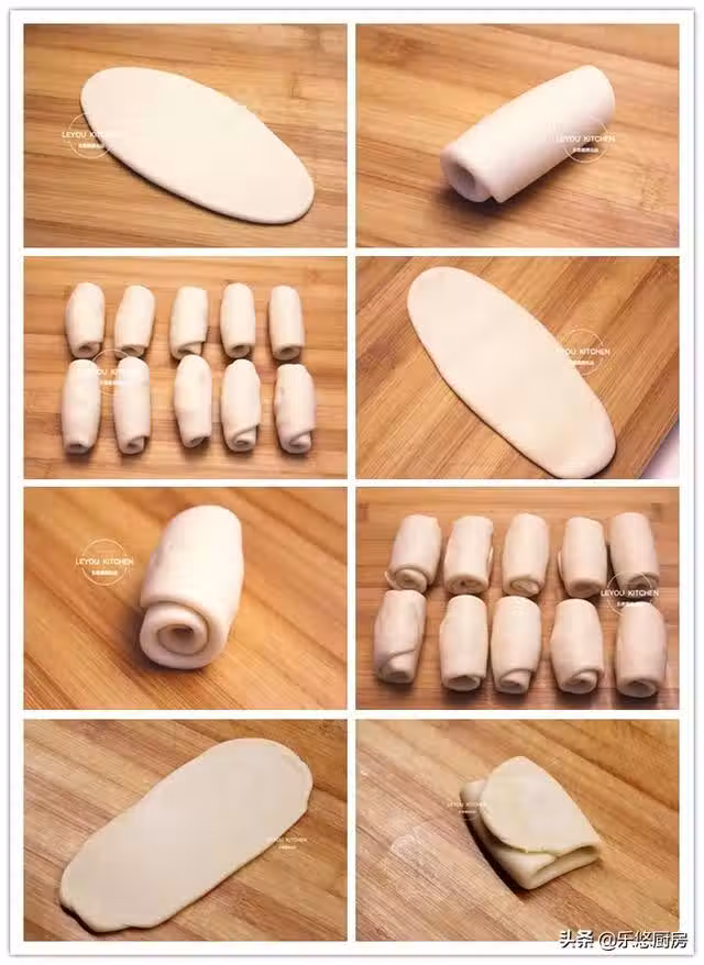 第十六步:將麵餅分成三等份,然後把兩邊朝著中間疊回來,如圖。