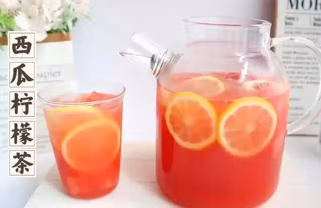 2.準備好西瓜汁,西瓜塊,檸檬片去籽,將西瓜汁倒入綠茶水中,加入西瓜塊和檸檬片,攪拌均勻,放入冰箱冷藏一兩個小時,喝的時候放入冰塊即可。