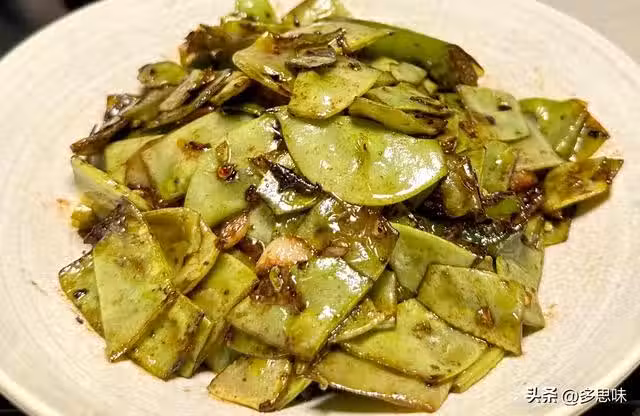 3、鍋里倒油(有豬油放豬油)炒香蒜末,再把青椒扁豆放進來翻炒 加一丟丟白糖、雞精,一丟丟醬油翻炒上色。再炒個一分鐘就行啦。真的好好吃,買的青椒比較辣,整個吃起來就是香辣咸香,真的巨巨巨下飯。