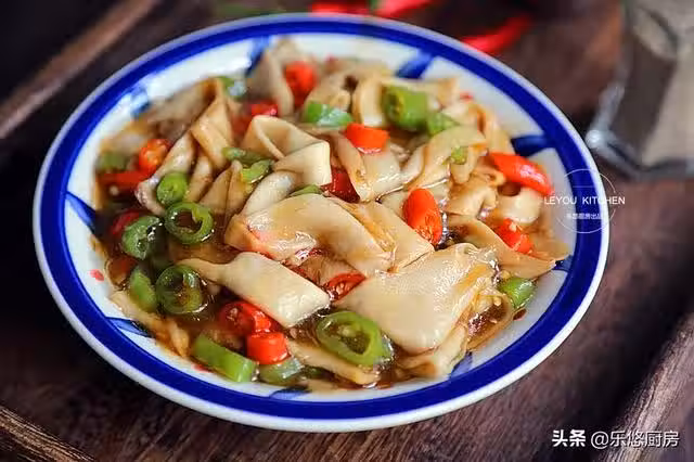 把杏鮑菇削成片,與青、紅辣椒一起炒,臨出鍋時澆一碗料汁,全程大約十分鐘就可以做好。削成片的杏鮑菇口感比刀切的更好吃,脆嫩中不失嚼勁,再裹上滿滿的湯汁,與米飯是絕配。