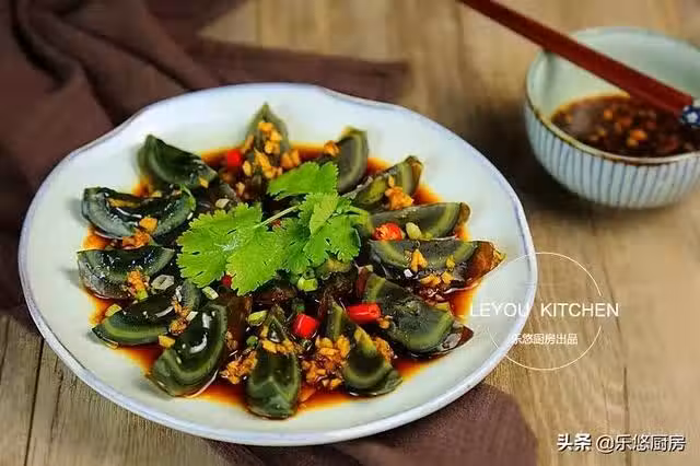 第一步:準備食材。皮蛋4個、姜1小塊、蒜適量、香蔥適量、紅辣椒適量。