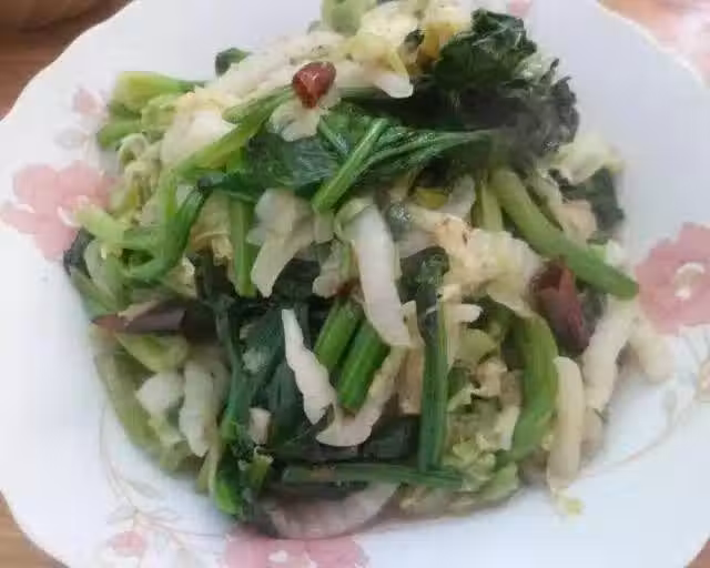 食材:白菜、菠菜、油、鹽、五香粉、干辣椒