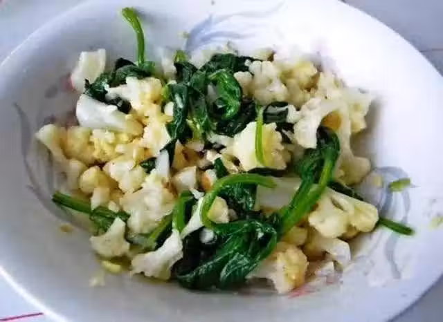 食材:菜花、菠菜、辣椒油、鹽、味精、姜
