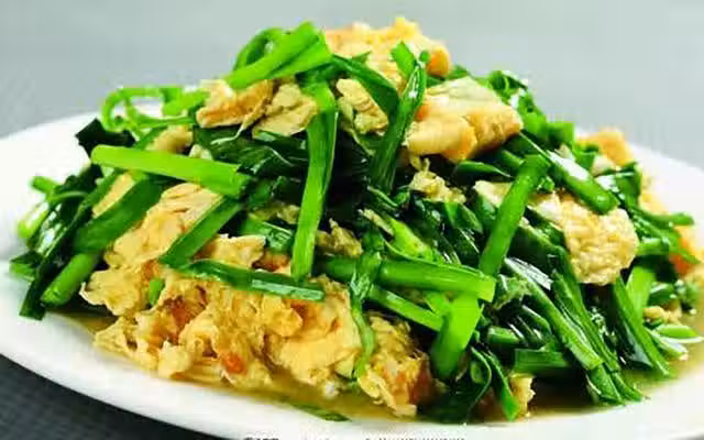 第四步,鍋內放油,放入切好的韭菜,然後放鹽,雞精,味精,再放入炒好的雞蛋。翻炒均勻後即可出鍋。