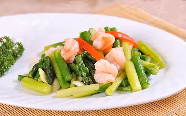 第四步,最後,鍋內燒油放蘆筍和蝦仁,鹽,雞精,味精,再用生粉勾一層薄薄得芡。中火翻炒均勻,出國前淋點色拉油增亮。