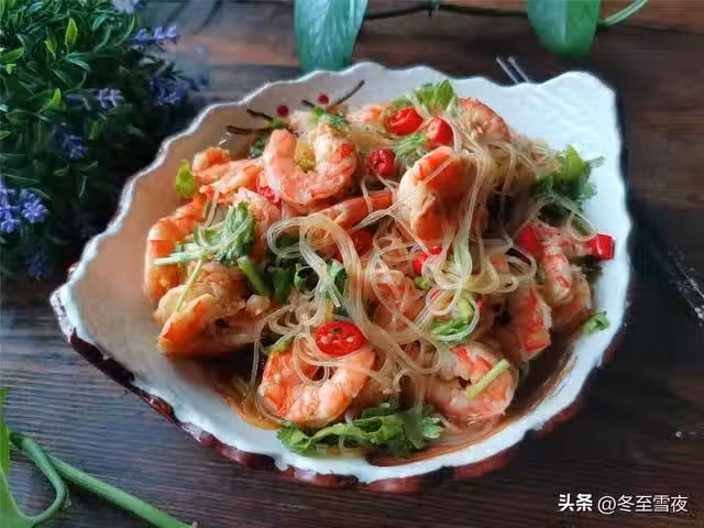【酸辣大蝦拌粉絲】所需材料:大蝦1斤、粉絲1把、香菜1棵、小米辣2-3個、油鹽適量、姜2-3片、大蒜3瓣、生抽1湯匙、香醋2湯匙、白糖半湯匙、辣椒粉半湯匙、料酒1湯匙、