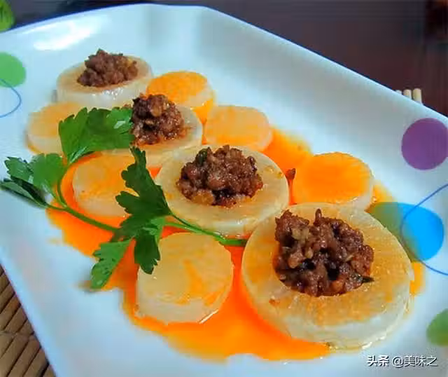 7、加熱好的蘿蔔釀肉,淋上辣椒油即可上桌。