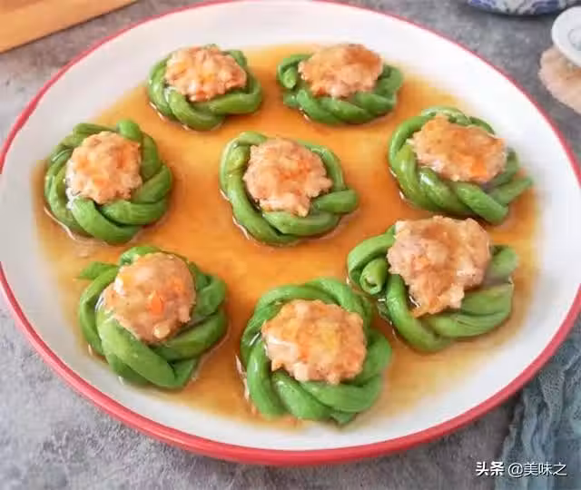 4、將焯過水的豆角盤起來形成一個花環狀。
