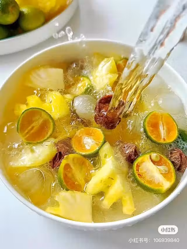 1.將菠蘿、小青檸、話梅放入碗中擠壓出汁