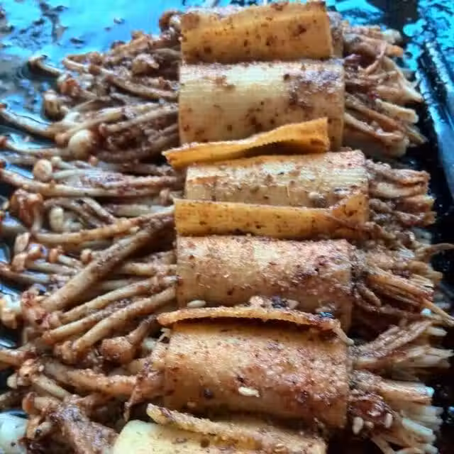 豆腐皮;金針菇;鹽;辣椒油;五香粉或白鬍椒粉;孜然
