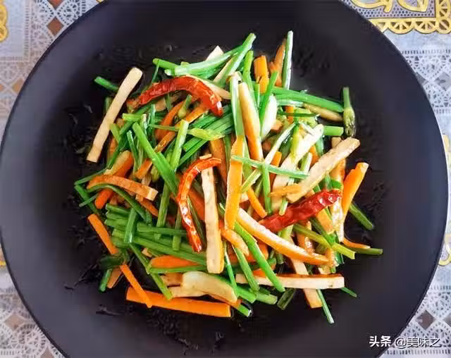 韭苔一小把、豆乾一塊、小蔥一顆、大蒜2粒、胡蘿蔔1/3根、紅尖椒4個、蚝油1勺、鹽少許、雞精少許、胡椒粉少許、