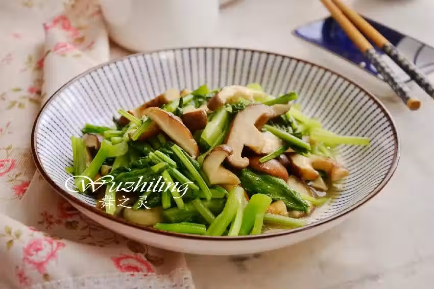 2、接著鍋裡面放油爆香蒜末,然後將香菇片先放入翻炒片刻,然後再加入菜心和少許的鹽,一定要大火翻炒,這樣能保持營養不會流失太多。