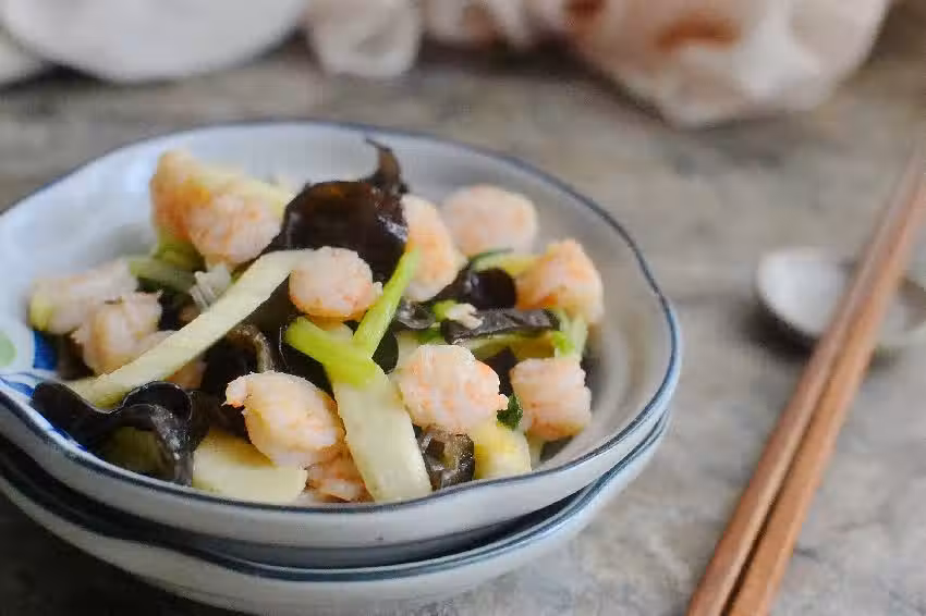 2、熱鍋冷油爆香薑絲蒜末,然後將木耳和茭白先放入,大火翻炒均勻後加入蝦仁、鹽、料酒和胡椒粉,翻炒入味即可。