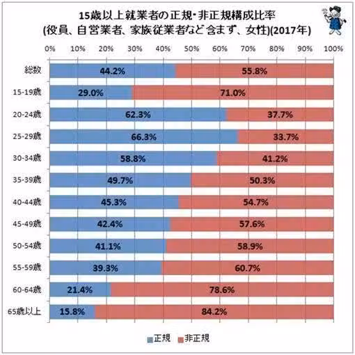 日本的年輕女性越過越窮,其中還有一個原因是有55.8%女性是「非正式員工」,她們找不到正式工作,也沒有社會保障,只能以兼差或打工的方式求生存,一方面還要承受來自正式員工的壓力,使她們保受社會歧視。