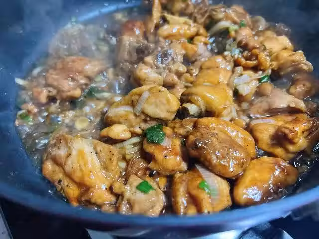 ✅ 做法的難點可能就是煎雞肉了,看到表面有金黃色就可以進行 下一步了,如果已經焦黃,後面燜制的過程縮短到3分鐘,不然雞肉就老了。