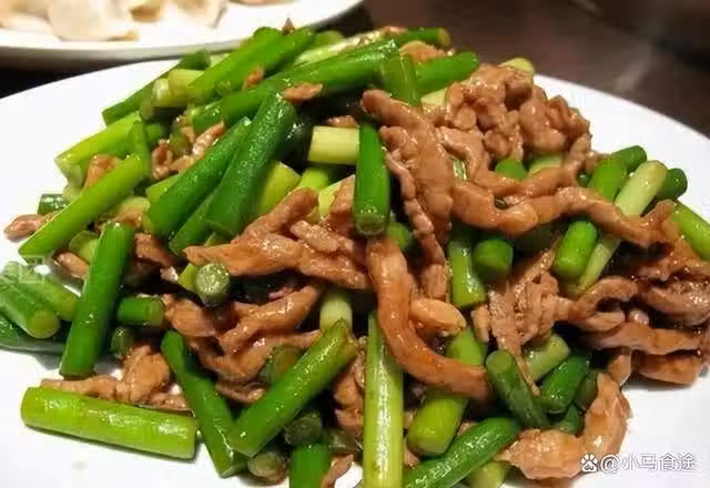 3.起鍋燒油,倒入肉絲快速滑散至變色斷生,倒入蒜苔一起翻炒至蒜苔成熟,加入彩椒絲,淋入少許水澱粉,炒勻即可出鍋裝盤。